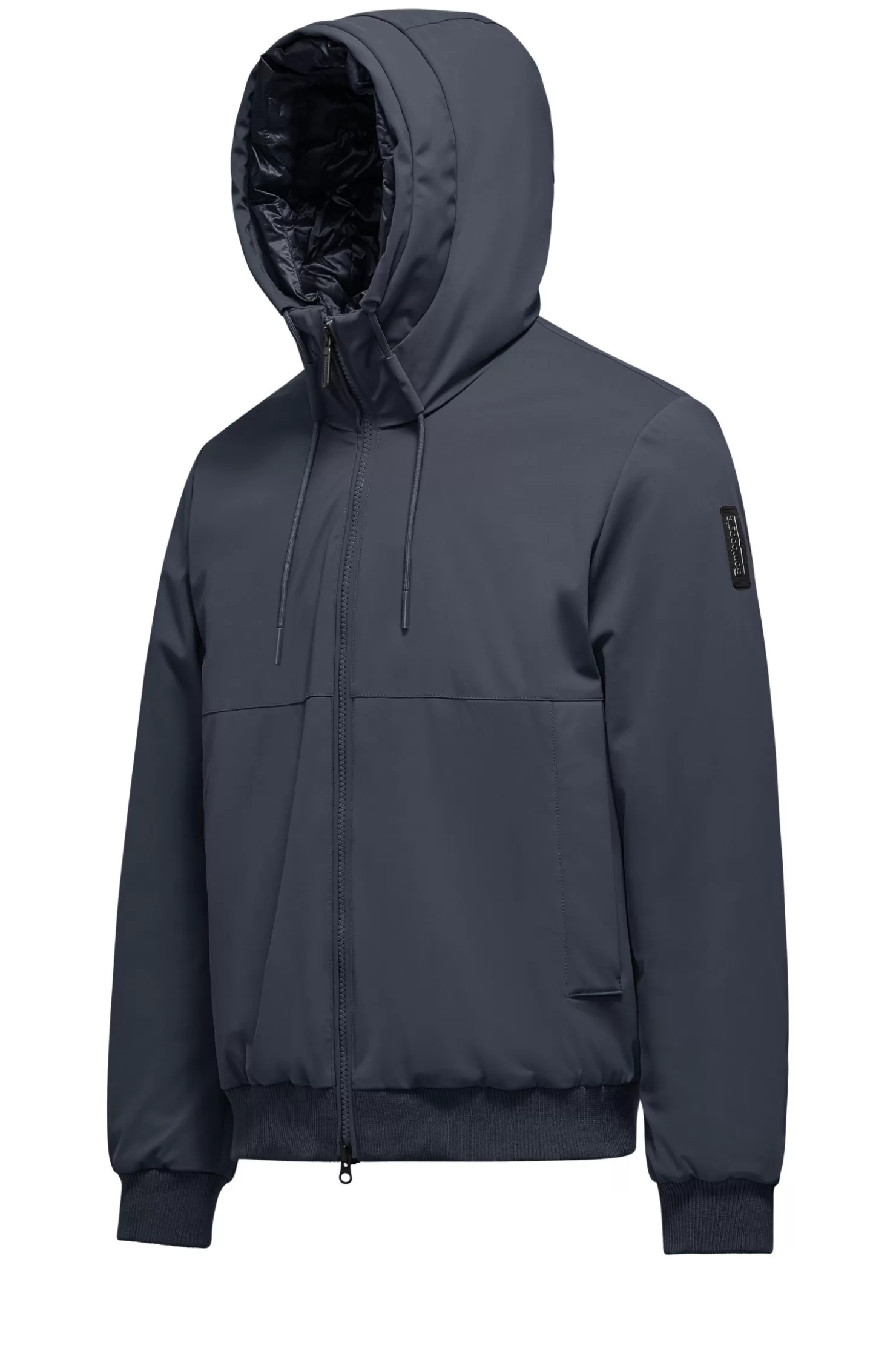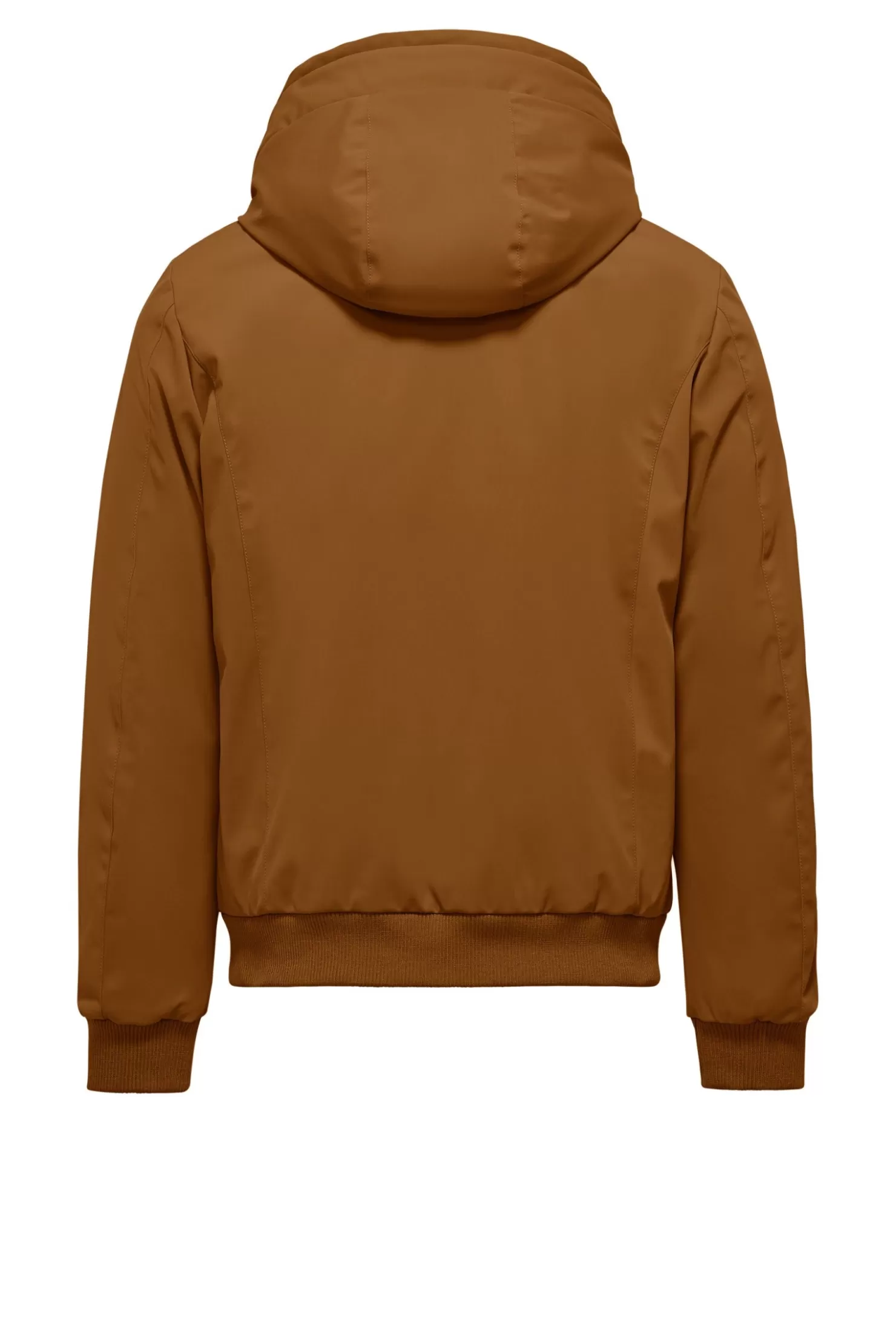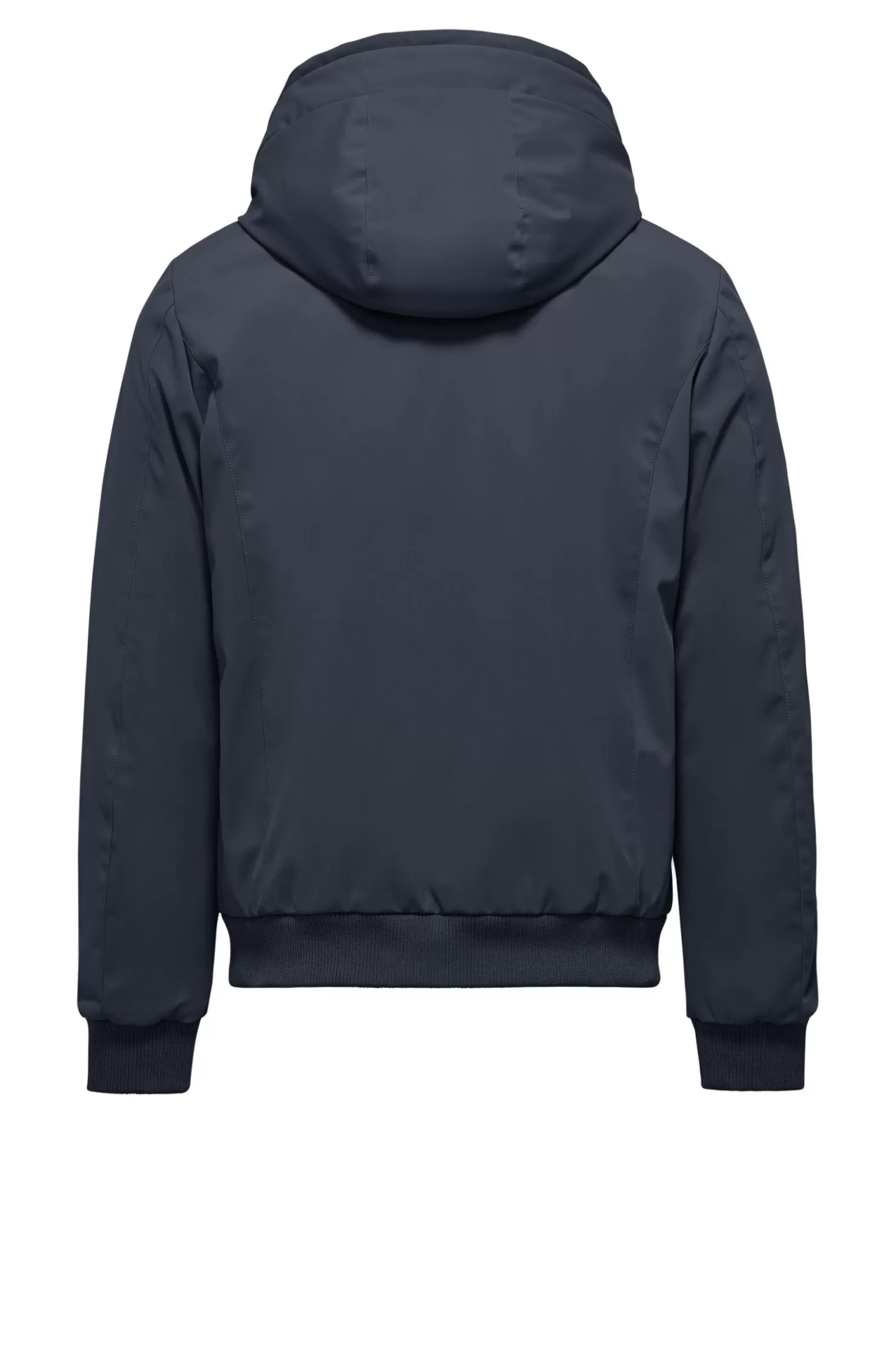 Gefütterte Bomberjacke aus recyceltem Material, warm und leistungsfähig, mit großer Kapuze und geripptem Gummizug in der Taille.