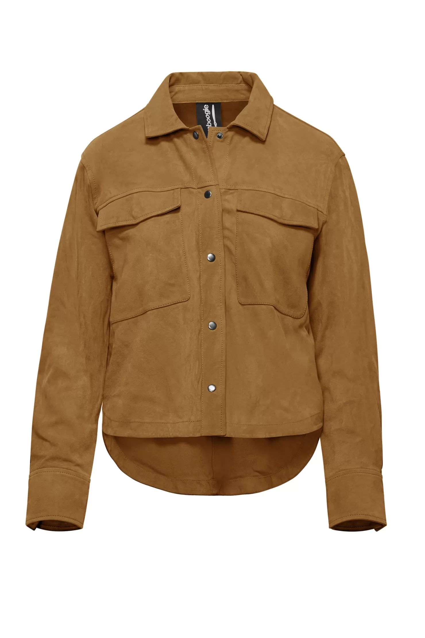 Hemdjacke aus Wildleder für Damen. Dieses Modell mit großen Pattentaschen und Stehkragen ist perfekt, wenn Sie auf der Suche nach einem aktuellen und trendigen Design sind