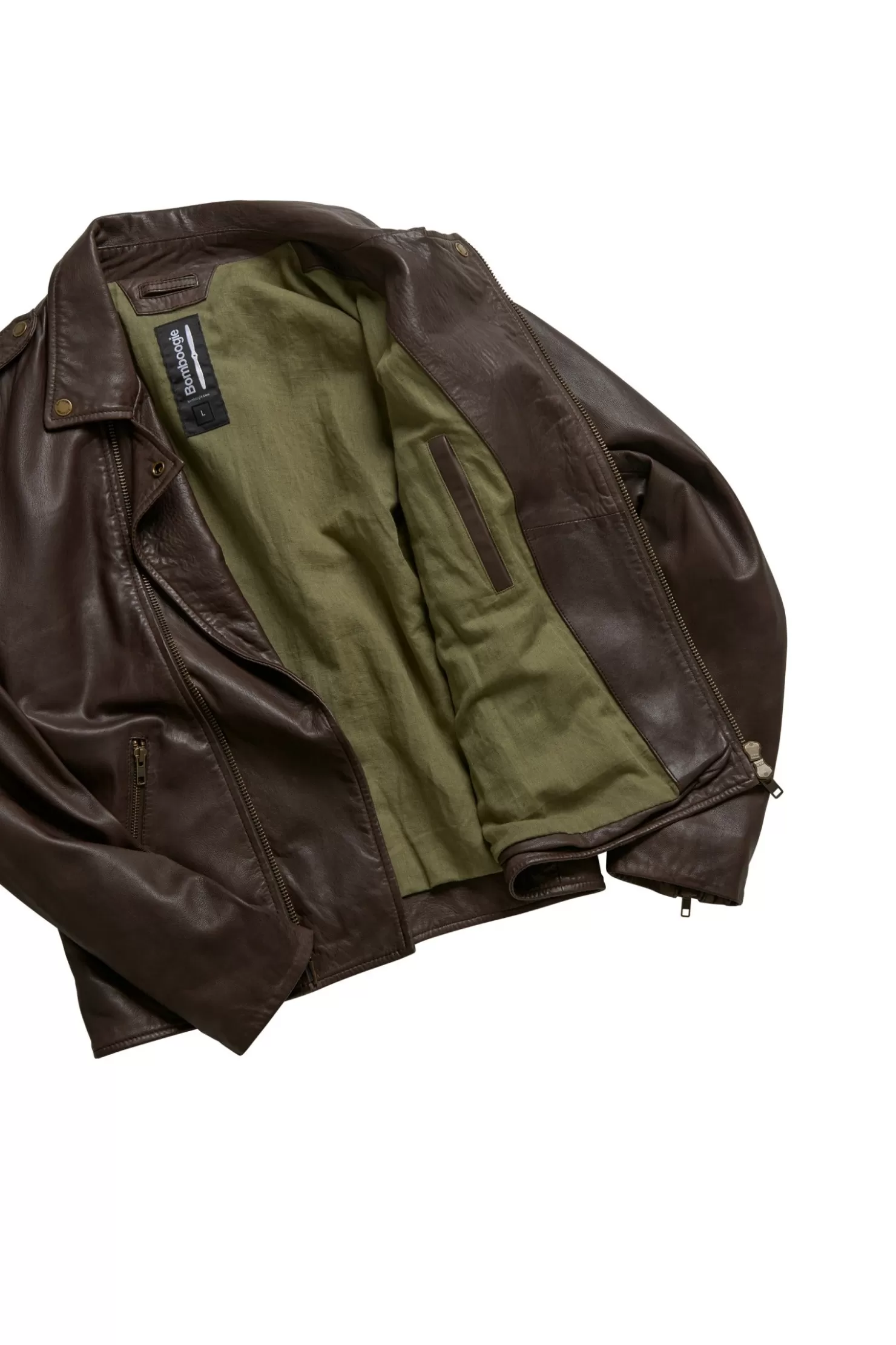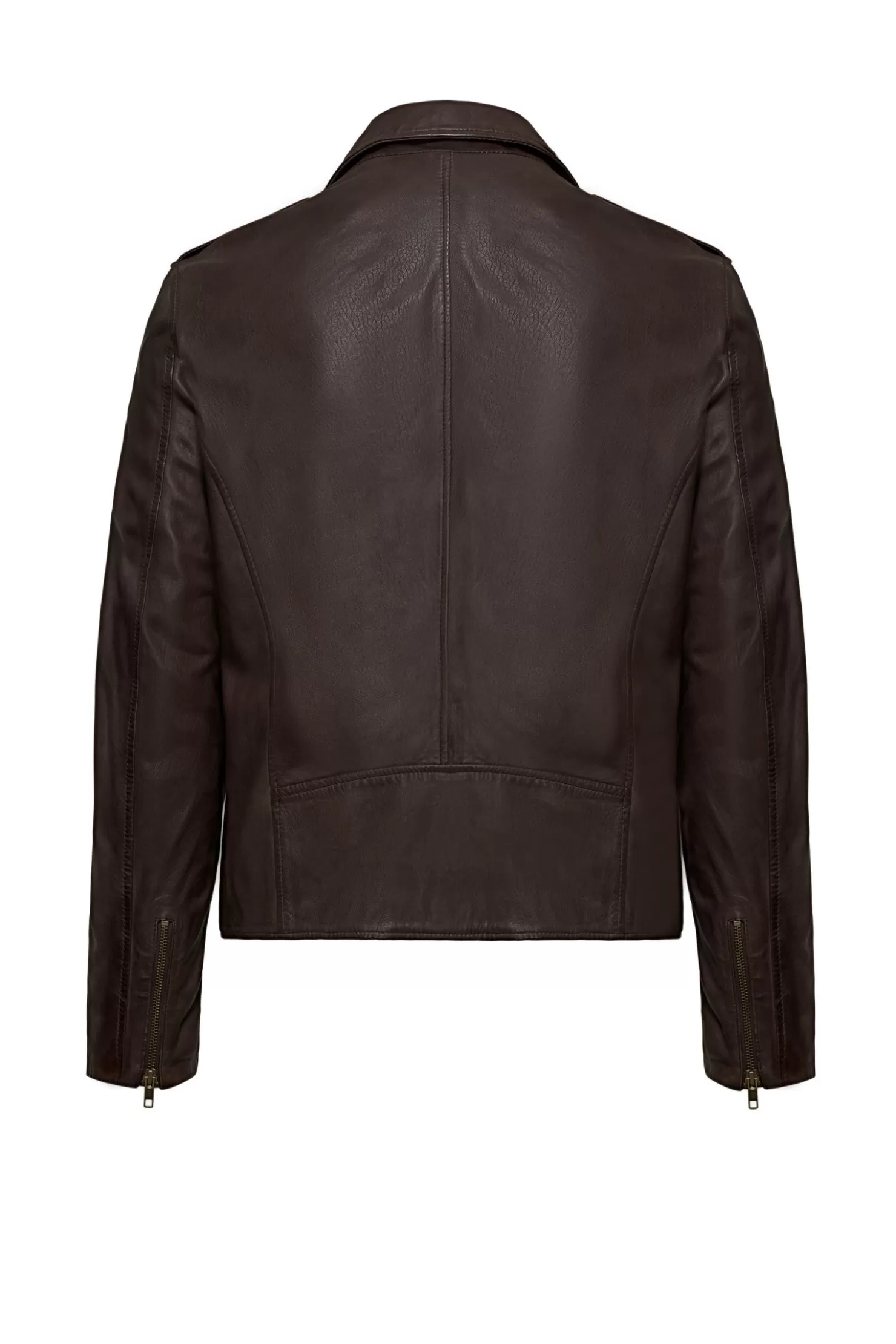 Biker-Jakce mit asymmetrischem Verschluss. Ikonisches Modell mit Nieten und Reißverschlusstaschen für einen markanten Look, der Entschlossenheit zum Ausdruck bringt.