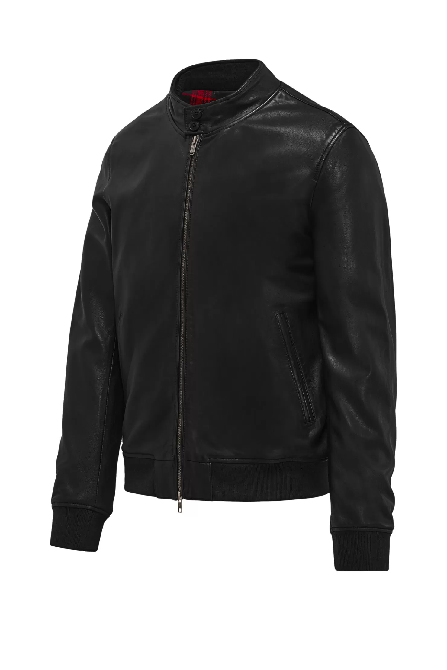 Lederjacke mit hohem Kragen, der mit einem doppelten Knopf geschlossen wird, mit elastischen Bändern an der Unterseite und an den Manschetten.