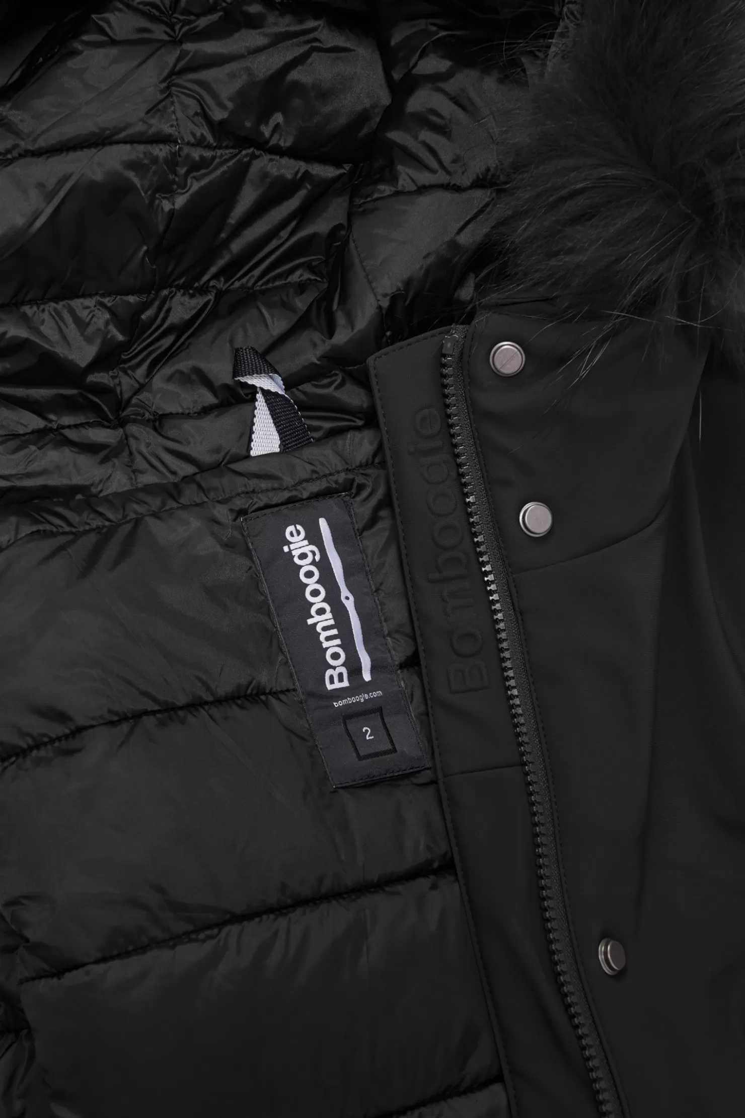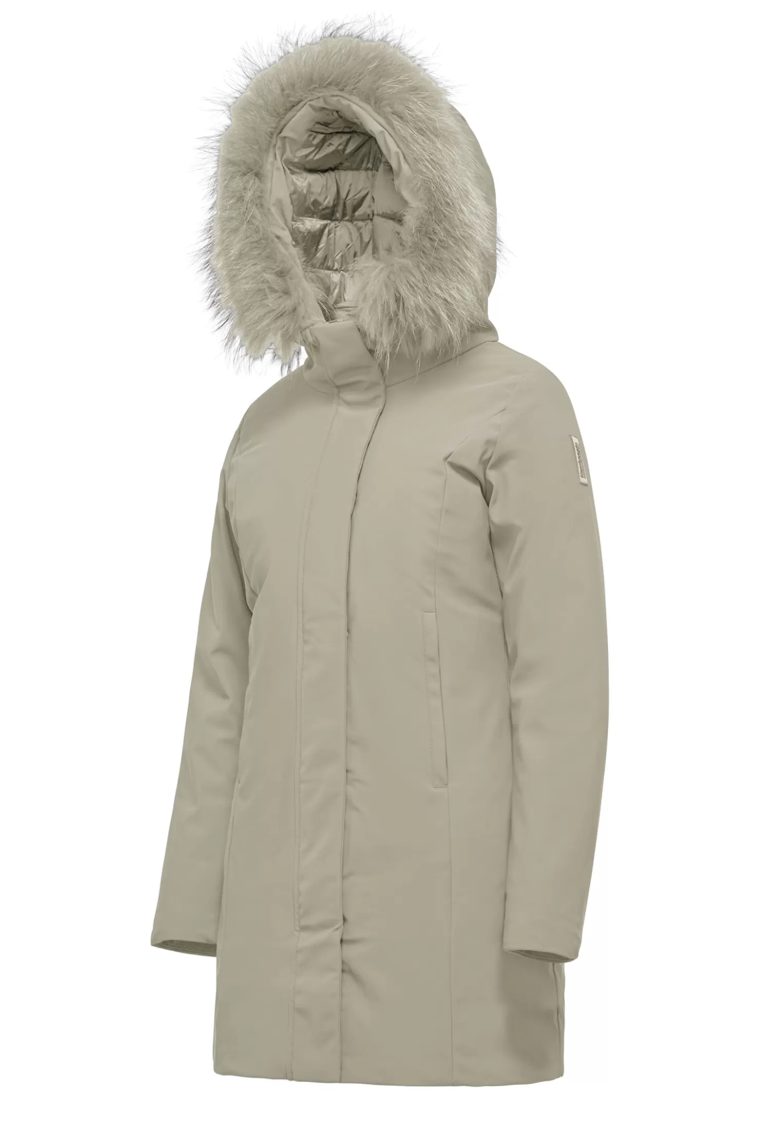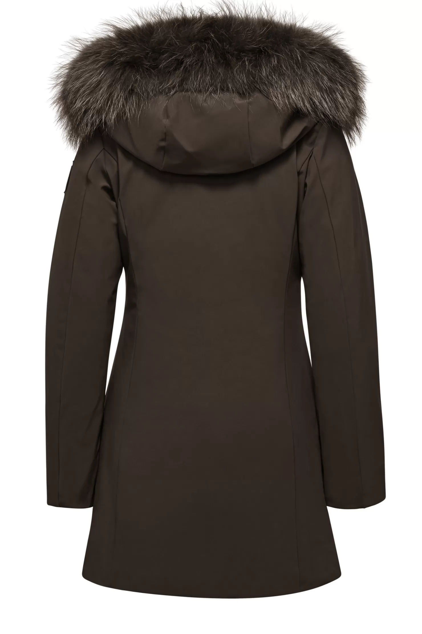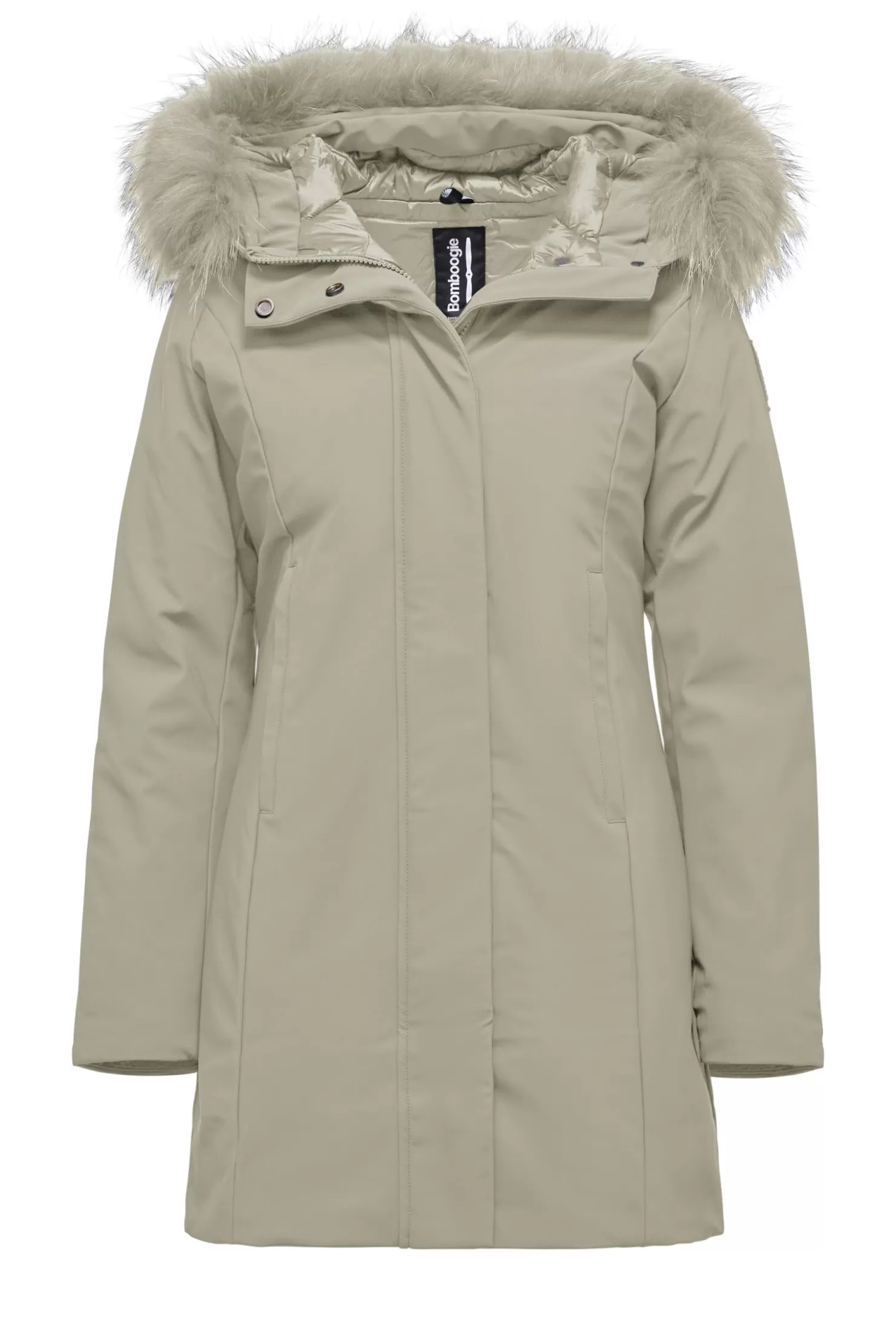 - Kapuze mit farbigem Waschbärfellbesatz, abnehmbar.