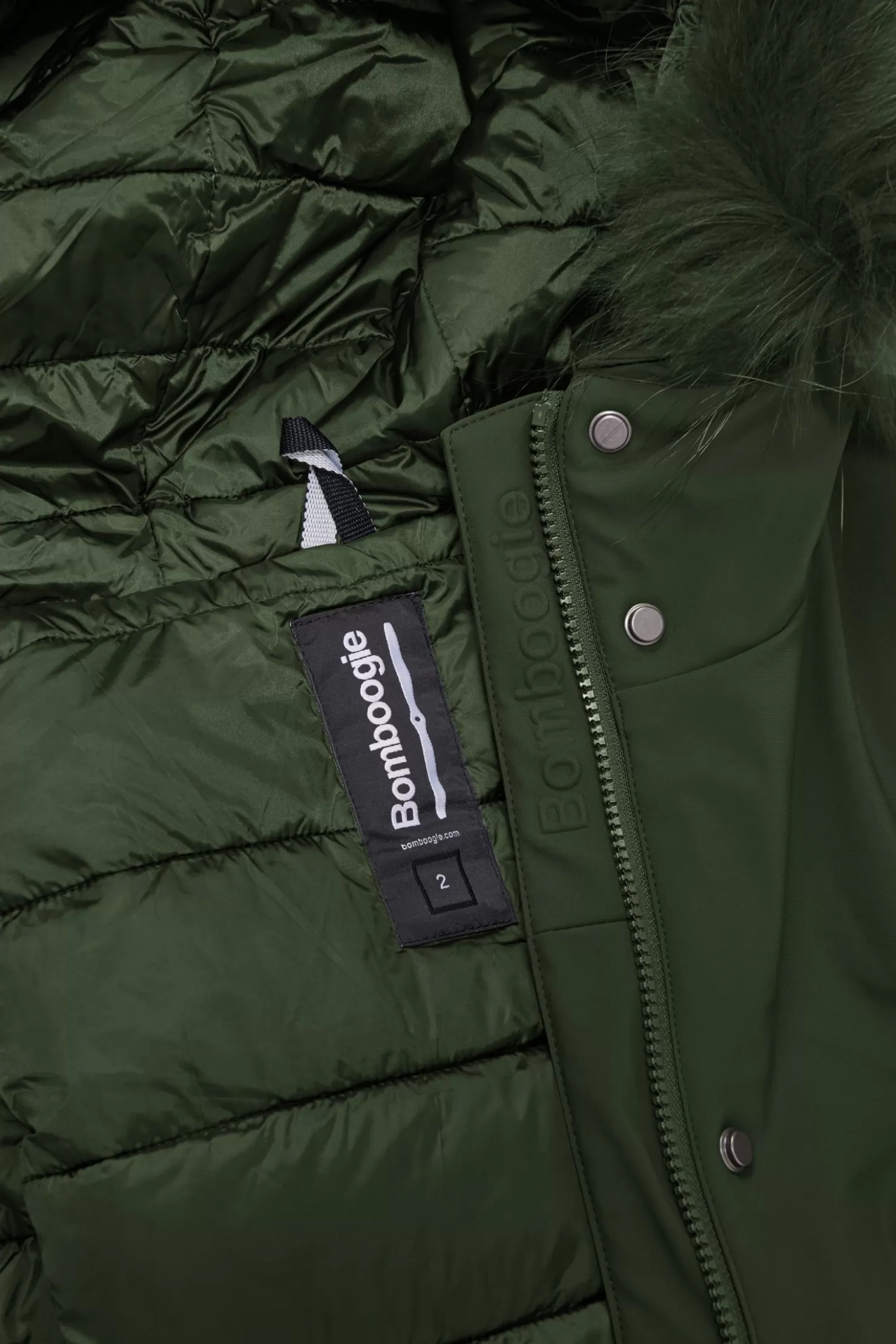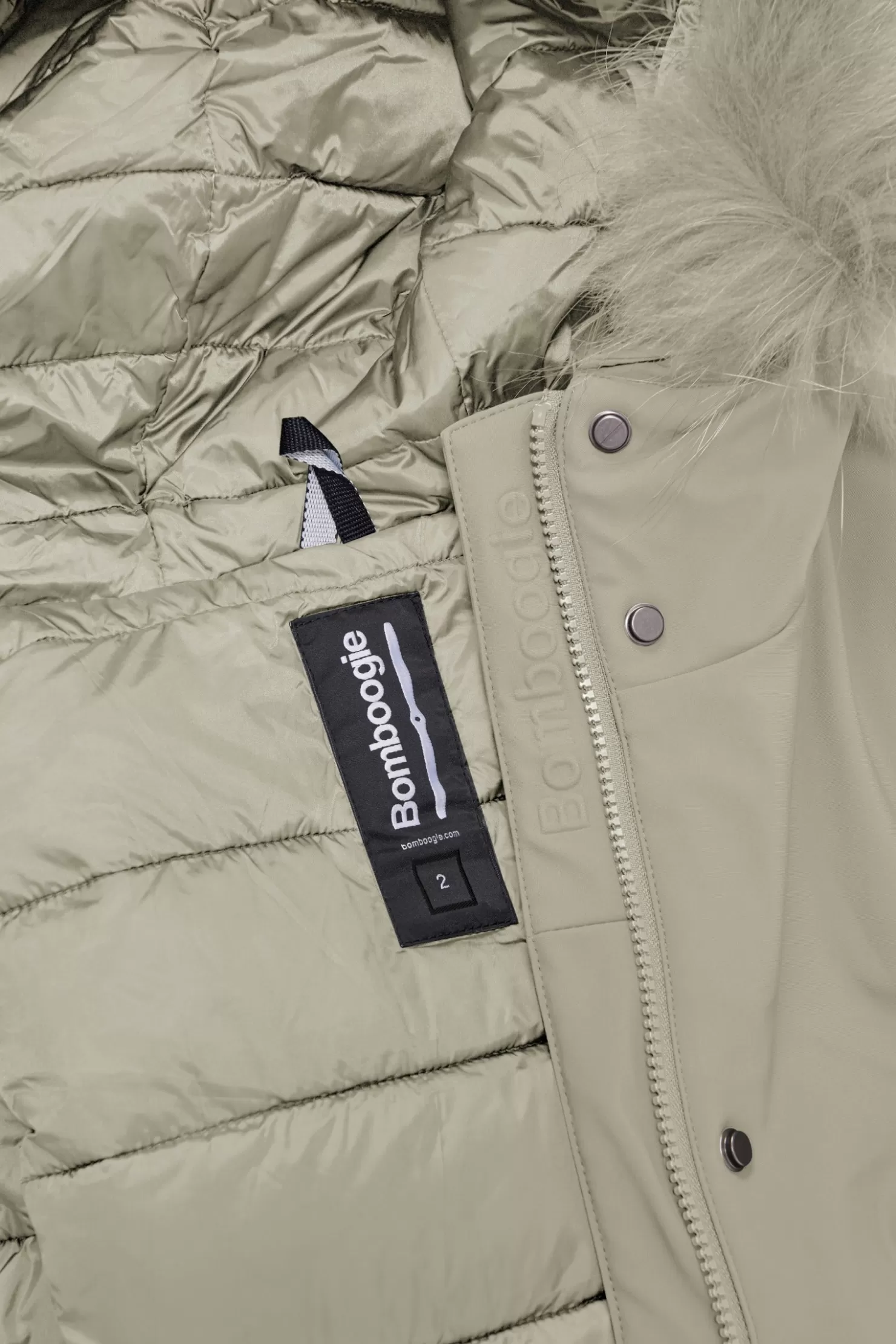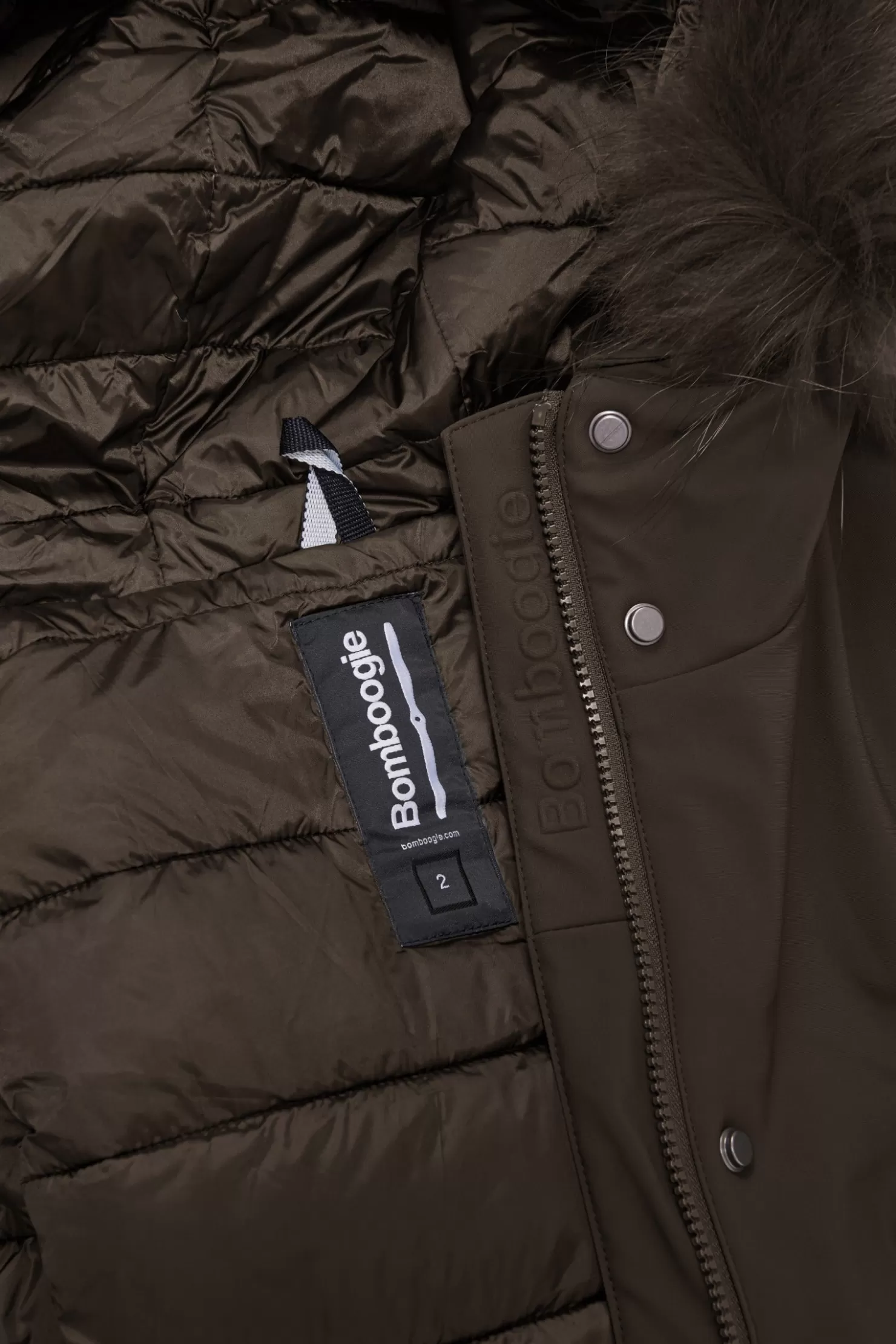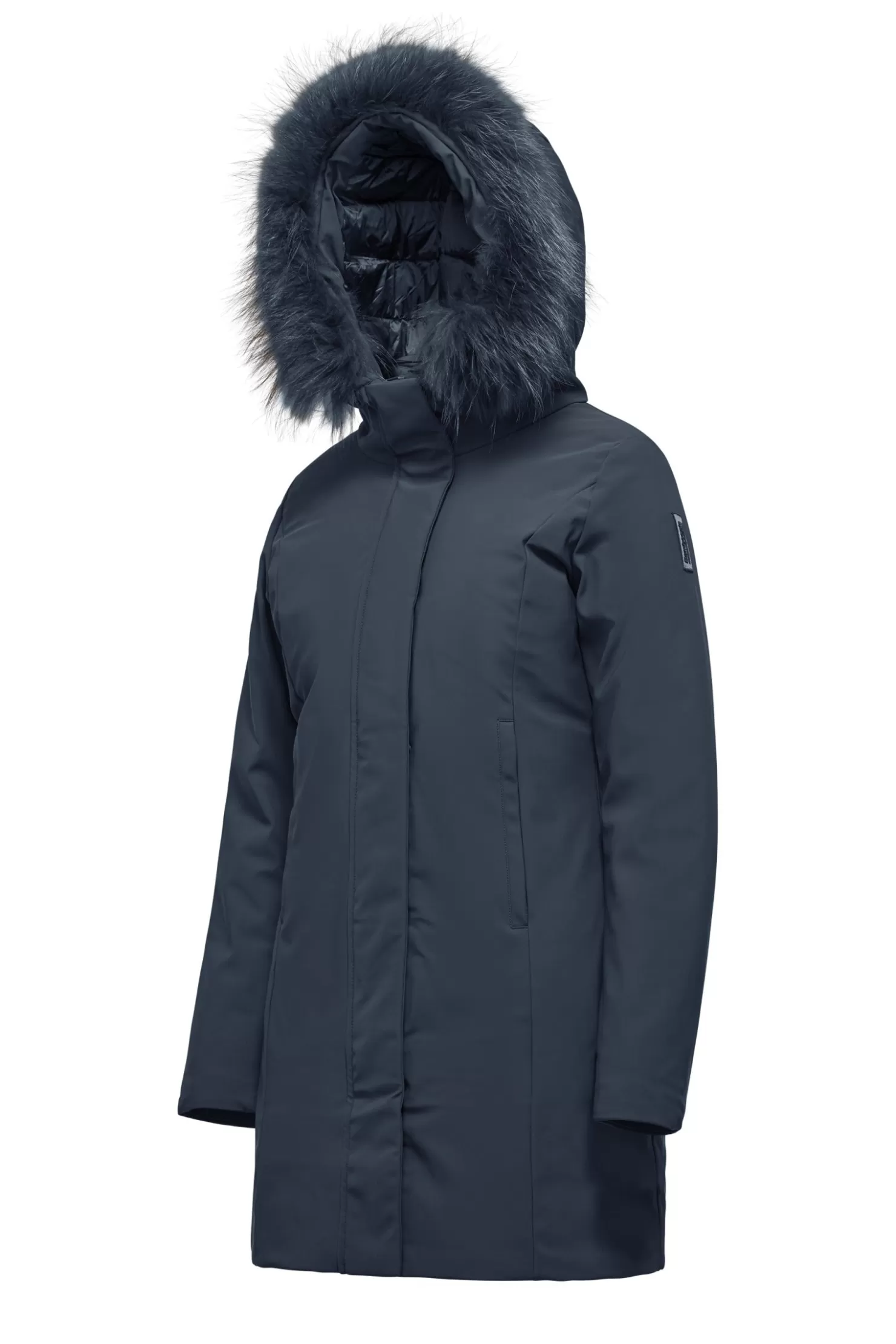 - Kapuze mit farbigem Waschbärfellbesatz, abnehmbar.