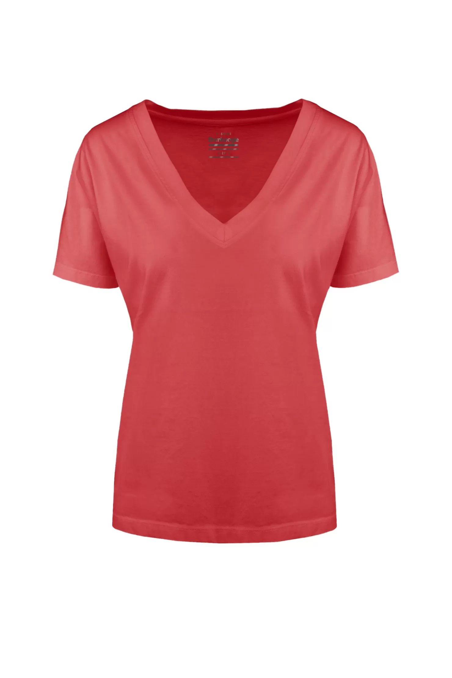 Kurzärmeliges Damen-T-Shirt, Modell mit V-Ausschnitt. Hergestellt aus 100% Bio-Baumwolle.Kühl, weich und atmungsaktiv auf der Haut. Ideal, um Sommeroutfits mit einem Hauch von Stil zu vervollständigen.